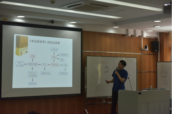 刘洋博士从他自身的创作出发,从科幻文设定的四大元素、设定的线性连接、Bethe图谱与复杂的设定链等方面向同学们讲授了如何在科幻文学创作中设立科学、富有创意的内核,并从假想科学、技术奇观、奇异世界及社会结构四个方面讲述了新鲜的核心设定的来源与产生。设定链的完整与逻辑的自洽是科幻文学创作中不可缺少的元素。因此,刘洋博士根据自身创作经验提出了“自洽指数”,用以判断设定链的完整性。