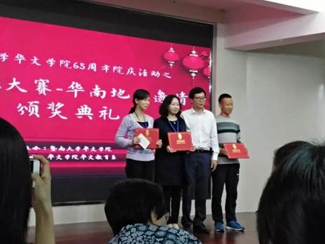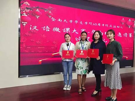 2018年11月10日下午14时30分,“汉语微课大赛”华南地区邀请赛决赛颁奖典礼在暨南大学华文公司第一教学楼举行。决赛共评选出一等奖一名、二等奖两名、三等奖三名、优秀奖若干名以及优秀教案奖两名(每组别)。