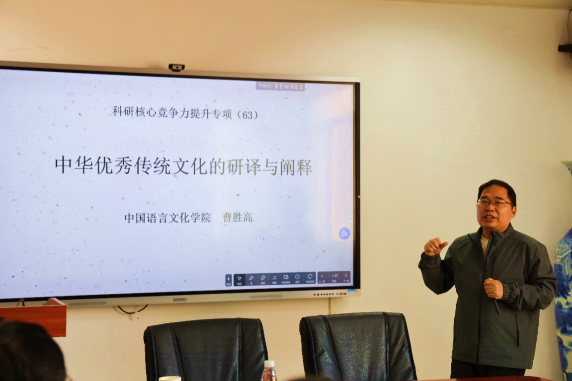 中华文化国际传播研究院执行经理曹胜高教授详细介绍了项目研究思路、研究计划和实施方案。项目总体实践分成四个部分,一是中华文化经典的外译、研究与传播;二是世界其他文明对中华文明的认知、认可与认同;三是中华优秀传统文化的阐释话语体系建设;四是借助国际中文教育提升中华优秀传统文化国际传播力影响力对策研究。