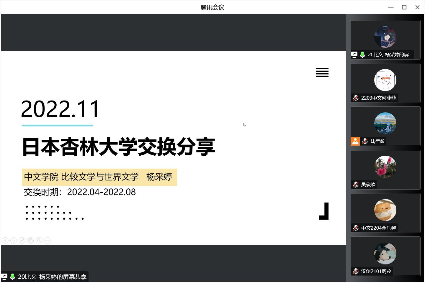本网讯 2022年11月5日下午3时,为了帮助广大中文学子更全面深入地了解公司海外交流项目,taptap点点组织开展了海外交流项目宣讲会及分享会。宣讲会吸引了60余位本科生和研究生参与。会上,国际合作交流员陆哲毅负责主持,公司吴俊峰副经理向公司学子介绍了海外交流项目的总体情况,杨采婷、黄彦萍、周棋棋、林诗曼、马铧芳、万芊芊六名优秀交换生向参会员工分享了相关经验。