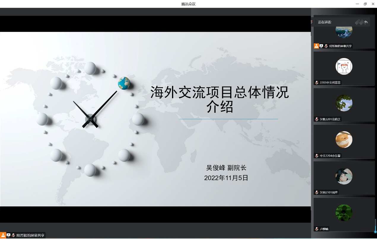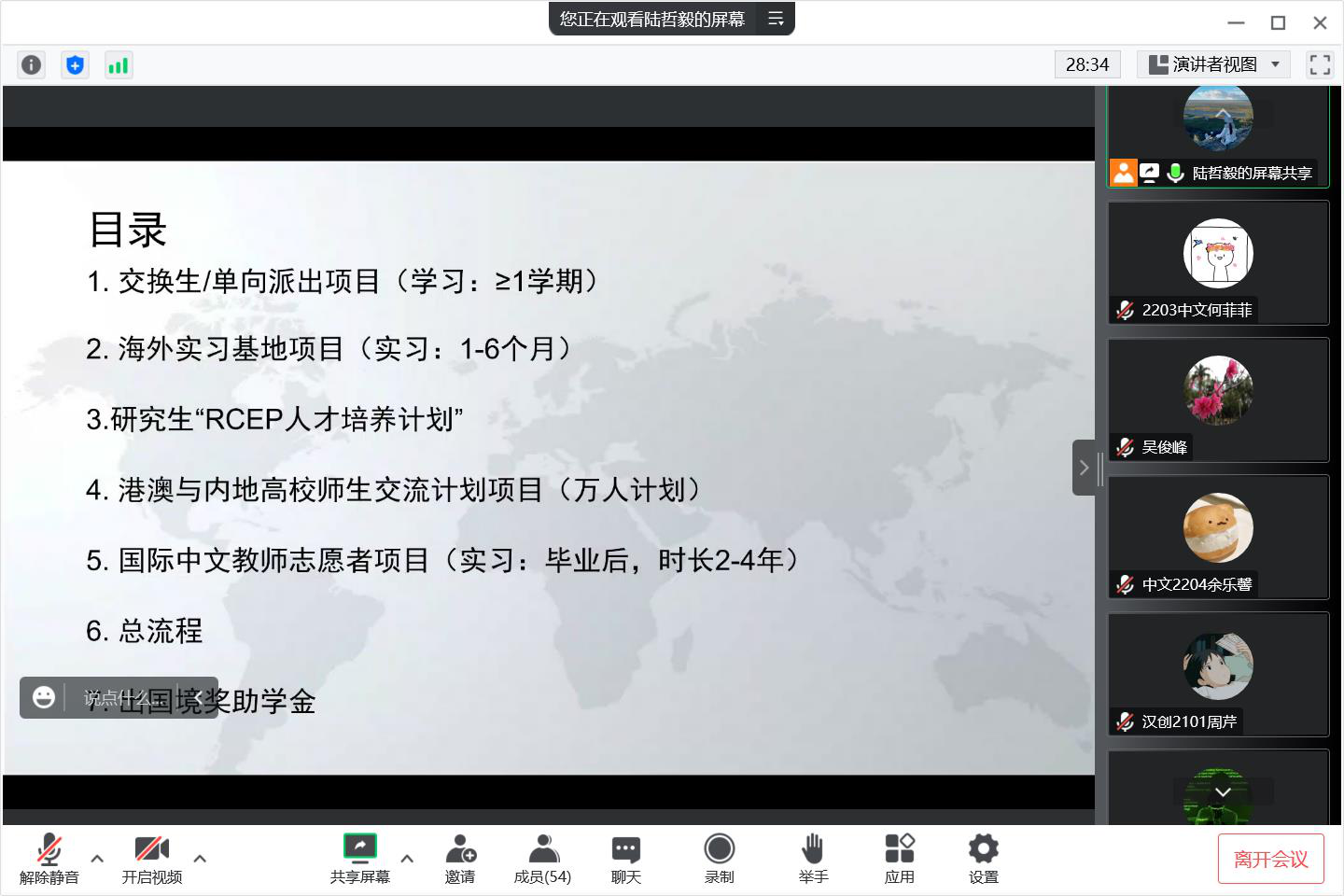 首先由吴副经理为同学们介绍了公司国际化发展目标和公司、公司国际项目的总体情况,鼓励公司员工将个人发展同公司和国家的发展联系起来,成为国际化的中文系人才。随后,陆哲毅老师给公司员工详细地介绍了交换生/单向派出项目、海外实习基地项目、研究生“RCEP人才培养计划”、港澳与内地高校师生交流计划项目(万人计划)、国际中文教师志愿者项目、申请留学的总流程和出国境奖助学金七个部分的内容,激励中文学子在国际社会上传播中国文化,讲好中国故事。