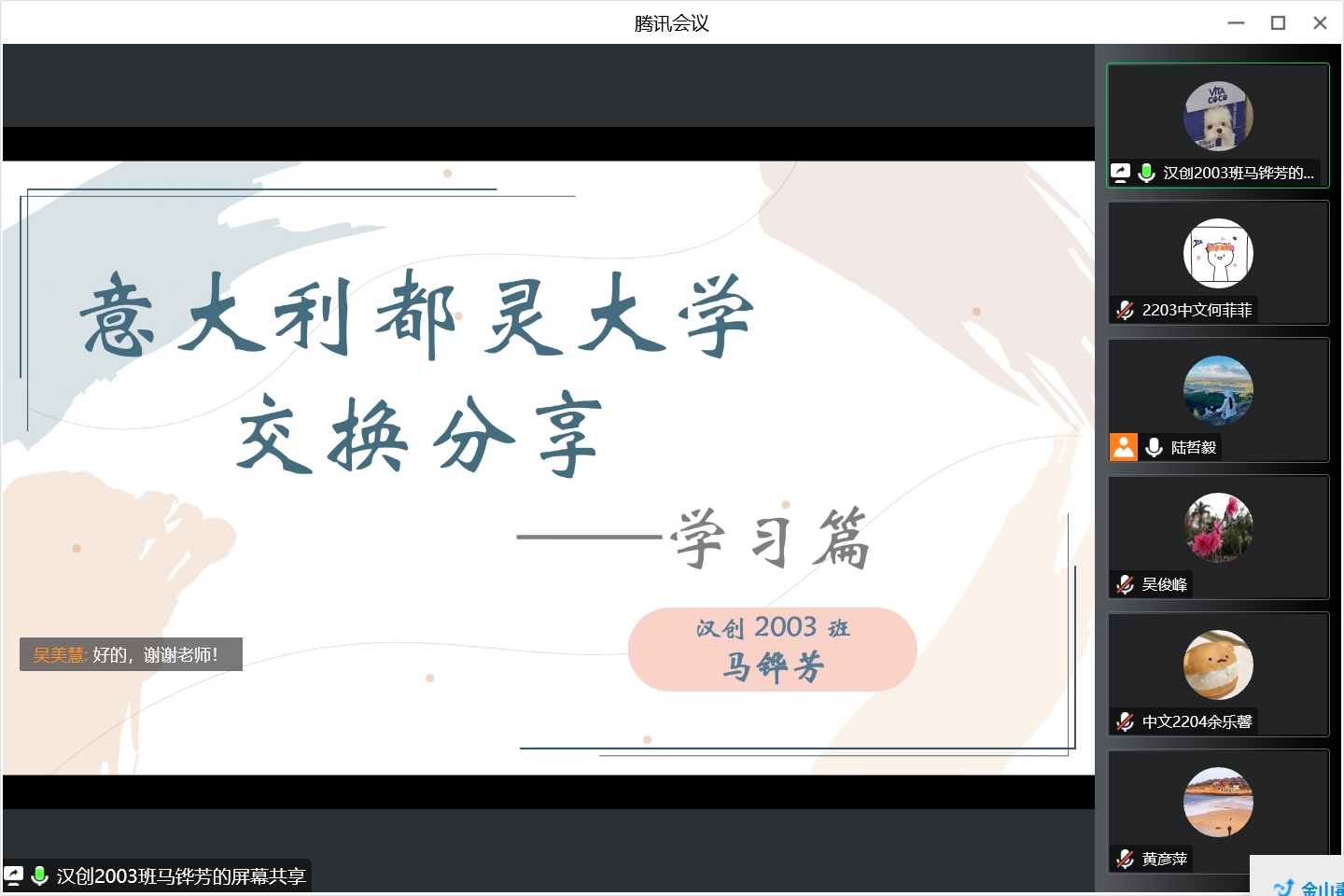 紧接着是优秀交换生分享留学经验的环节。曾于日本杏林大学交流学习的杨采婷从留学前准备、职工活以及交流感想三个方面进行了分享。除此之外,还有黄彦萍、周棋棋、林诗曼三位同学分别介绍了自己前往韩国济州大学留学的具体情况,从选拔条件、前期准备、校园日常三个部分分享了自己参加海外交流项目的经验。前往意大利都灵大学的马铧芳和万芊芊分别从学习体验和文化体验分享自己的留学感受。通过几位学姐各异的分享,将真实的学习经历和各国的风土人情带到了同学们面前。