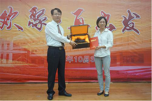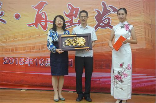 随后,伍方斐为公司聘任的首批员工导师颁发聘书,范静静为热心员工颁发“热心员工”证书。在老教师、员工赠送贺礼环节里,公司收到了来自於贤德教授的书法作品两幅,员工陈锡钖赠送的潮州精品木雕,员工林小珊赠送的红酒一批,员工郭楚斌赠送的青花瓷大花瓶一对,员工谭巧娜赠送的“开拓进取”黑檀摆件,员工陈巍赠送的特色精品剪纸一幅以及员工赵春晓赠送的个人作品集一套。