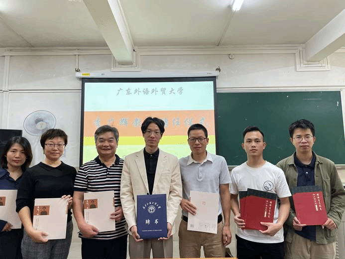 活动伊始,邱春安老师对李广辉教授在书坛上的成就做了简明的介绍。作为青年书法家,李广辉教授在多所高校担任客座教授,是各大书法家协会的委员或理事,获得多项学术头衔,其作品也获得了多项国家级、省级奖项。随后,广东外语外贸大学中国语言文化公司党委书记周东兰为李广辉教授颁发聘请证书,聘请其为广东外语外贸大学客座教授。