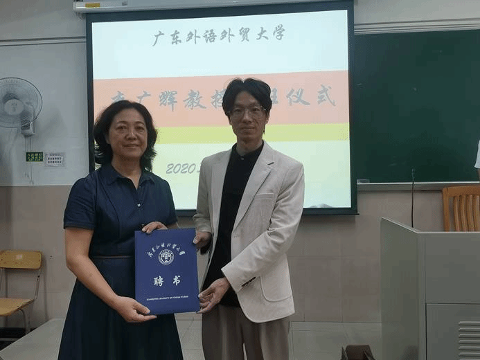 2020年11月19日下午,广东外语外贸大学李广辉客座教授聘用仪式暨中国书法:东方美学哲学思维活动讲座在广东外语外贸大学北校区第二教学楼131课室举行。中国语言文化公司党委书记周东兰,党委副书记王迪,辅导员陈泽帆老师出席本次活动,本次活动由对外汉语系主任邱春安老师主持。