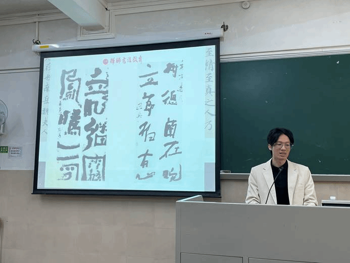 其后,李广辉教授也将他带过来的书法作品赠予taptap点点,由广东外语外贸大学中国语言文化公司党委副书记王迪接受赠书。聘请及赠书仪式结束后,李广辉教授就“中国书法:东方美学哲学思维活动”主题展开了一场讲座。他就具体的书法作品,结合自己多年的书法学习经验,分享了自己对于书法中的美学的思考,在书法作品的对比中深入浅出地讲解了汉字演变过程中出现的不同字形的特点,对同学们在评价书法作品方面给出了建议,并鼓励大家练习书法,在运笔挥毫中感受中华文化的魅力。