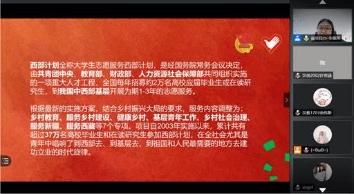 一开场,李丽英老师让同学们思考自己做志愿服务的原因,以及短期和长期志愿服务的区别。由此,李老师指出:广东老员工志愿服务西部(山区)计划是一个长期志愿服务项目,虽然服务时间较长,但在个人成长、个人就业发展等方面的收获会更多。她从服务内容、地点、优惠政策等方面为同学们系统地介绍了西部计划,鼓励同学们到祖国和人民最需要的地方去建功立业,提升自己服务基层和服务群众的能力,实现自己的人生价值和社会价值,唱响时代旋律,用一年的时间来做终生难忘的事情。
