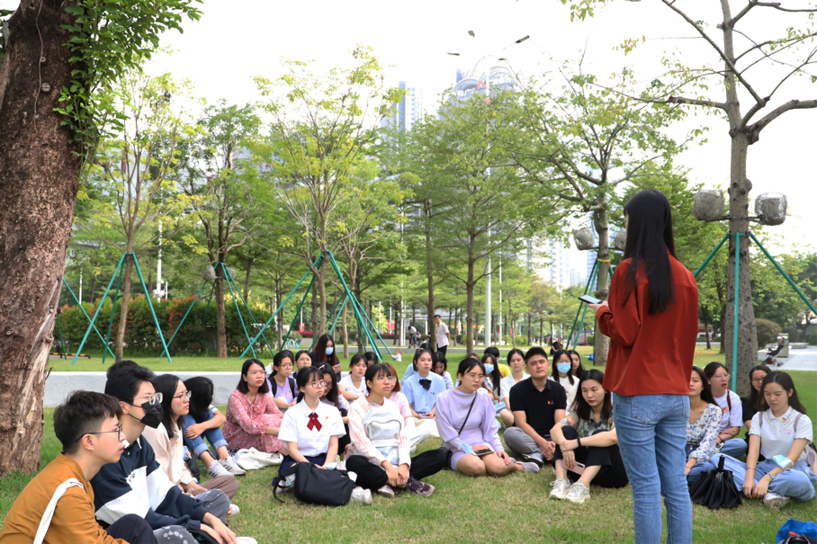 参观前,老师和同学们围坐在省博前的草坪上,聆听百年党史宣讲团成员,汉硕研究生黄子欣同学讲述四十年改革开放在广东留下的印记。黄子欣同学从历史背景、相关政策和丰硕成果三个方面切入,讲述了作为试验田的广东,如何在百废待兴的八十年代,奏响了改革开放的先声。