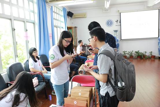 团学志愿者除楼驻扎在三教四楼外,校道上、宿舍门前、也少不了他们的身影。藏青马甲、热情笑容是他们的标配。他们主动上前询问新生是否需要帮助、为新生指明路线、帮助新生搬运行李、递上一杯清凉的水…中文新生们一踏进校园,就有家的感觉。志愿者们的工作得到了新生们的一致好评。
