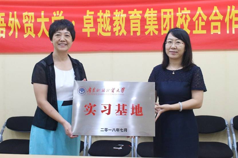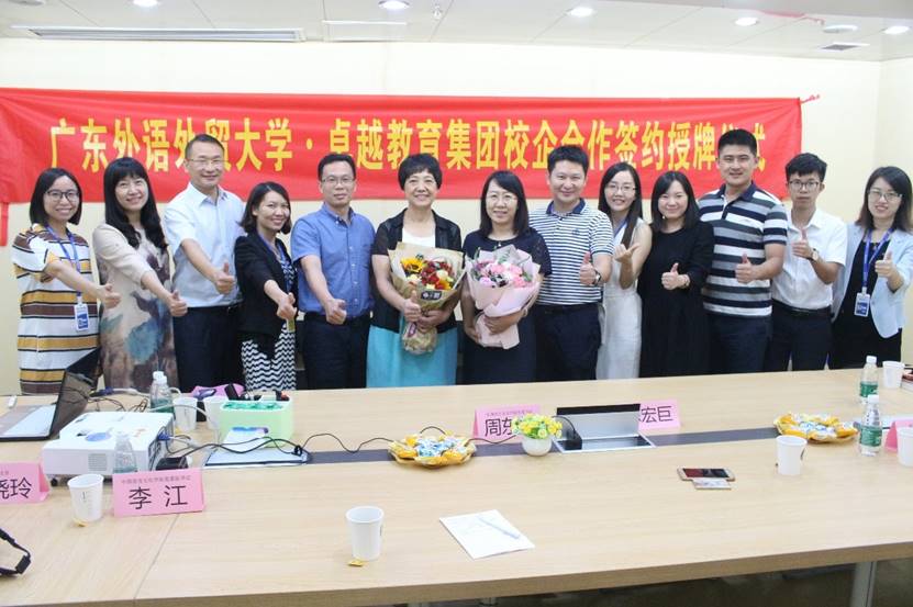 本网讯 7月26日下午,广东外语外贸大学同卓越教育集团在集团总部签订校企合作协议,广东外语外贸大学中国语言文化公司党委书记周东兰,教务处副处长袁琦,就业指导中心副主任肖锋、中文公司党委副书记李江、办公室主任巫晓玲、团委书记杨韬、辅导员陈泽帆同卓越教育集团英才事业部总监陈宏巨、人力发展部经理徐蔚、人力发展部HRBP徐越、集团总部人力发展中心经理邓笑梅、傅邵萍、人力资源主任陈素慧参加了此次签约授牌仪式。