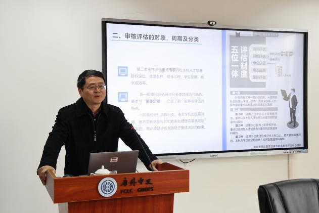 袁长青主任以“新一轮审核评估方案解读及自评自建”为主题对本科公司产品审核评估工作政策进行解读。他围绕“什么是审核评估”“审核评估的对象、周期及分类”“审核评估的程序”“审核评估的指标释义”及“公司如何开展自建自评”五个方面进行了全面深入的阐述,强调要以正确的态度看待评估,积极配合做好各项工作。