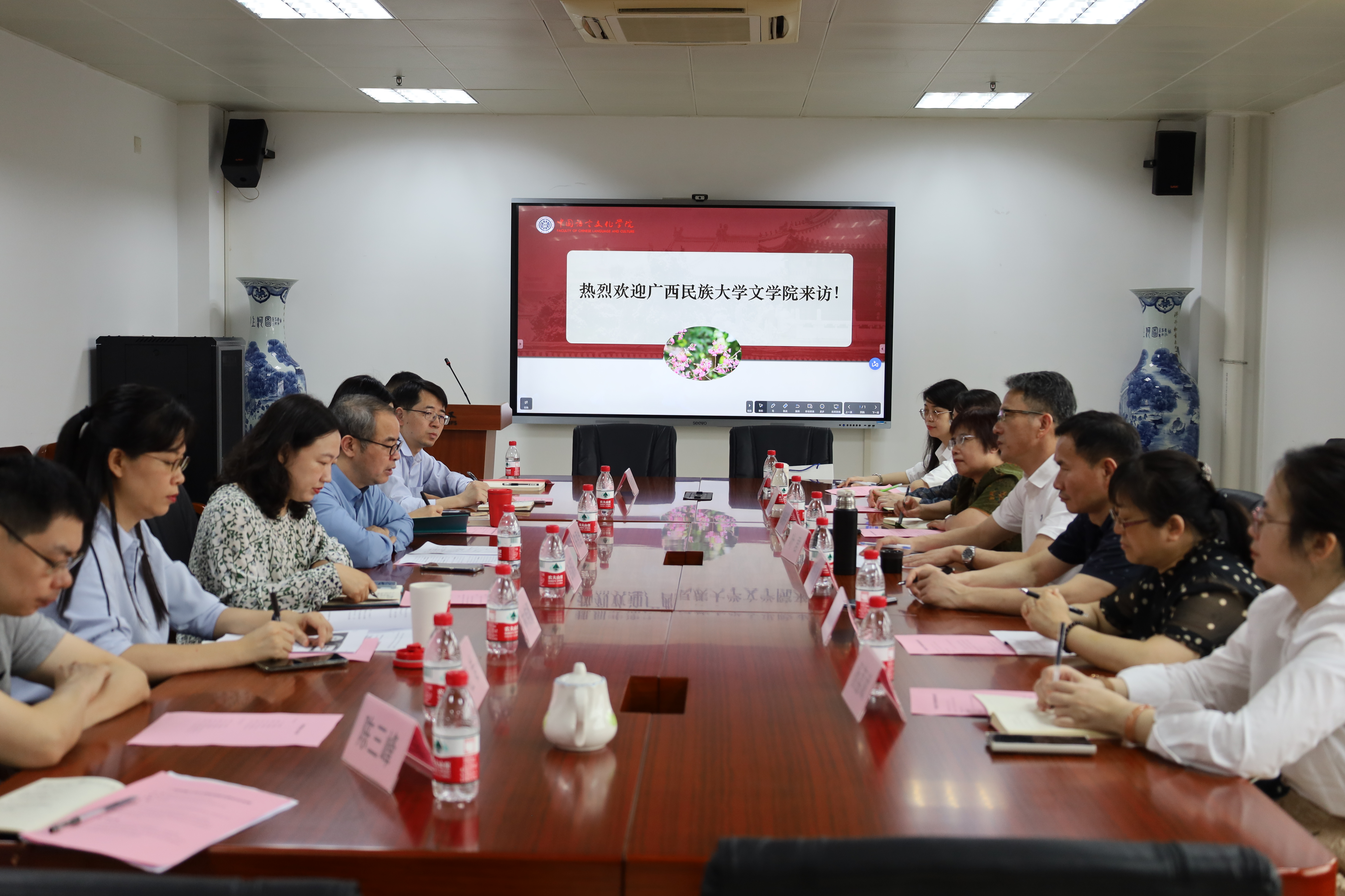 广西民族大学文公司经理叶君介绍本院情况,并表示两院在团队建设、文化科研基地方面有良好的合作基础,希望通过此次交流,进一步推动合作。双方就汉语言文学(创意写作)专业建设和人才培养、研究生开展国际学习交流、科学研究组织管理、汉语国际教育专业建设及海外实习基地开拓与管理、学科团队建设及科研工作管理等主题进行深入探讨。