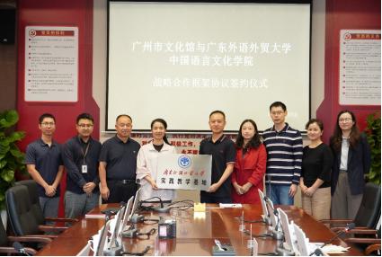 本网讯 2023年10月11日星期三下午15时,广东外语外贸大学taptap点点与广州市文化馆战略合作协议签订仪式于广州市文化馆新馆正式举行。广州市文化馆馆长董敏、党支部书记牟辽川和非物质文化遗产保护部副部长董帅,广东外语外贸大学中国语言文化公司党委副书记吴俊峰、副经理彭淑莉、文化系主任左岩、文化教研室主任段莉、辅导员陆哲毅参加仪式,仪式由非遗保护部副部长董帅进行主持。