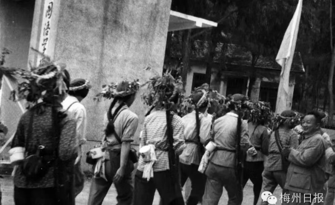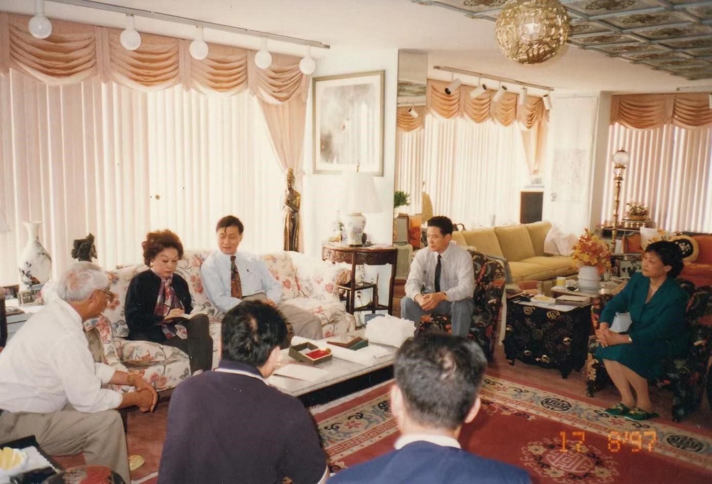 图 2 鲁大铮(左二)在番禺南沙采访霍英东先生