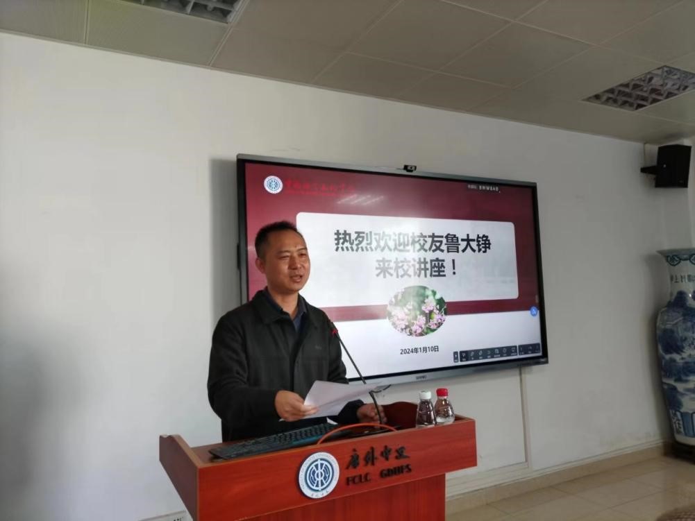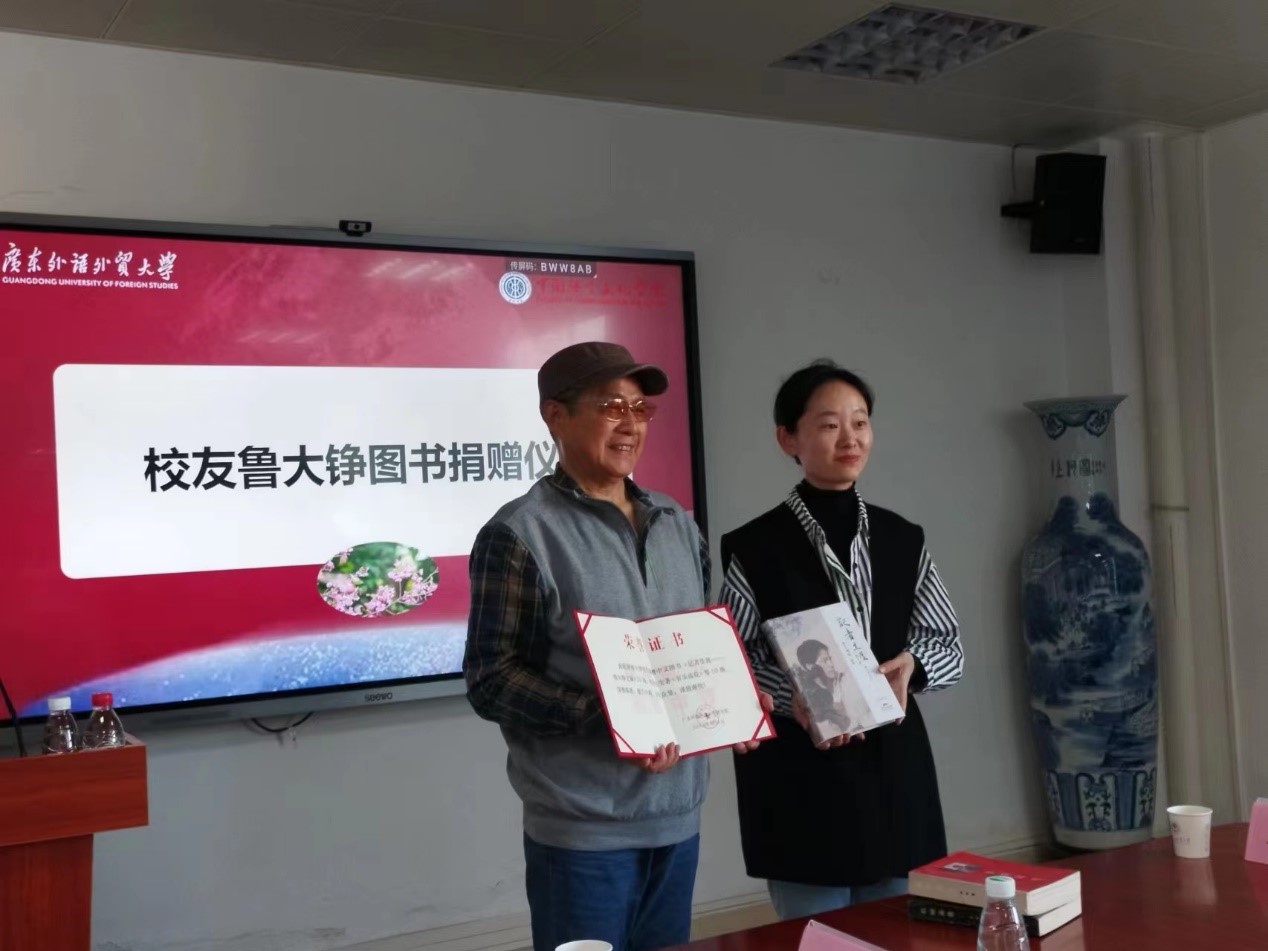 本次讲座以图书捐赠仪式起始,鲁大铮员工伉俪向广东外语外贸大学图书馆捐赠《记者生涯——鲁大铮文集》及李凌先生著作《音乐流花》等一批图书。孟小玲老师代表广东外语外贸大学图书馆接受捐赠并向鲁大铮颁授捐赠证书。