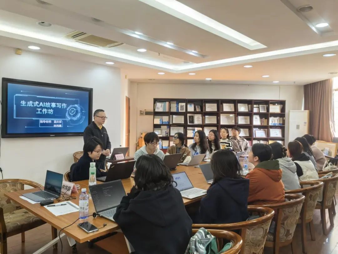 2025年1月7日上午,由澳门科技大学博士研究生、东莞开放大学蓝庆保老师和广外林炜娜老师主讲的生成式AI故事写作工作坊在广东外语外贸大学白云山校区七教412教室举行。本次写作工作坊不仅介绍了AI写作的基本操作和技巧、探究了AI与人类写作创意的融合途径,也以师生互动的工作坊形式为怀揣故事创作梦想的15名同学打开了一扇通往全新写作世界的大门。