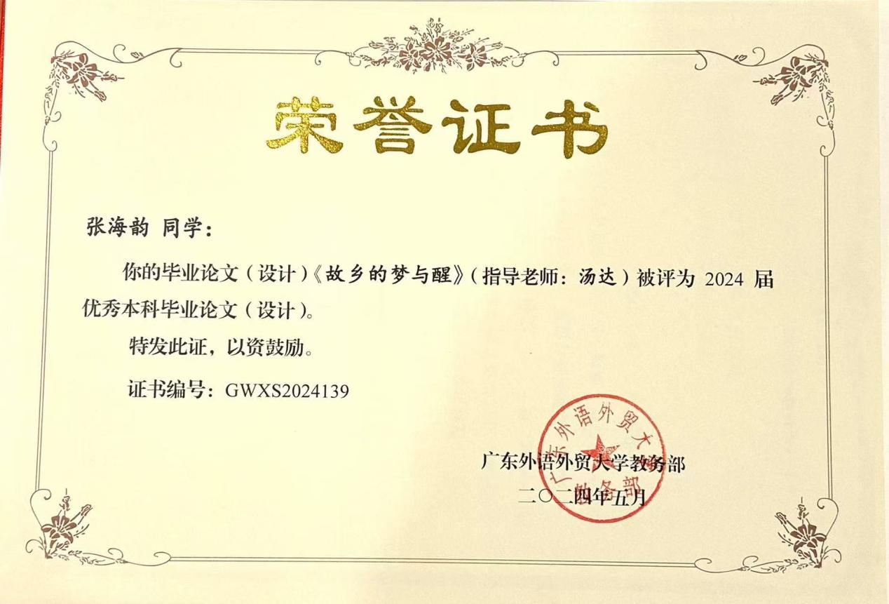 张海韵《故乡的梦与醒》(指导教师:汤达)获评广外2024届优秀本科毕业设计