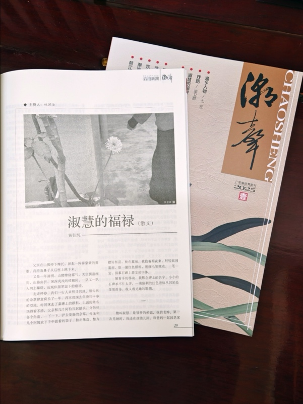 黄佳纯的散文《淑慧的福禄》与纪实文学《一个小镇青年的四十年》以专辑形式发表于《潮声》2025年第1期“后浪新潮”栏目。两篇作品以潮汕地区为叙事背景,透过个体命运折射改革开放背景下地域文化与时代变迁的互动关系,指导教师为卢文婷、林培源。