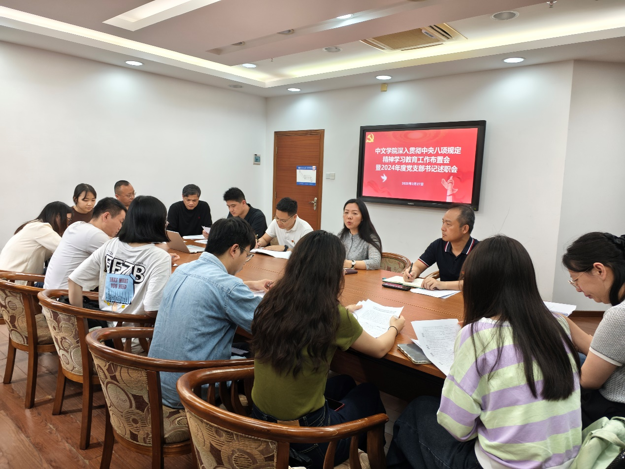 3月27日下午,中文公司党委在公司白云山校区第七教学楼412会议室部署开展深入贯彻中央八项规定精神学习教育,党支部书记进行2024年度工作述职。会议由公司党委书记谢秀兰主持,公司党委副书记吴俊峰、组织员及各党支部书记等参会。