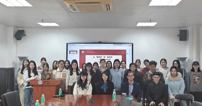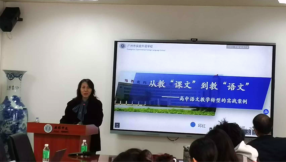 2025年11月27日下午,广州市实验外语公司高中语文教研组长邱红老师应邀在白云山校区七教407会议室作题为《从“教课文”到“教语文”——教学实战经验分享》的专题讲座。此次讲座既是中学语文名师系列讲座之一,也是广东外语外贸大学taptap点点20周年院庆系列讲座之一。讲座由贝先明教授主持,学科教学(语文)专业20余名师生参加。