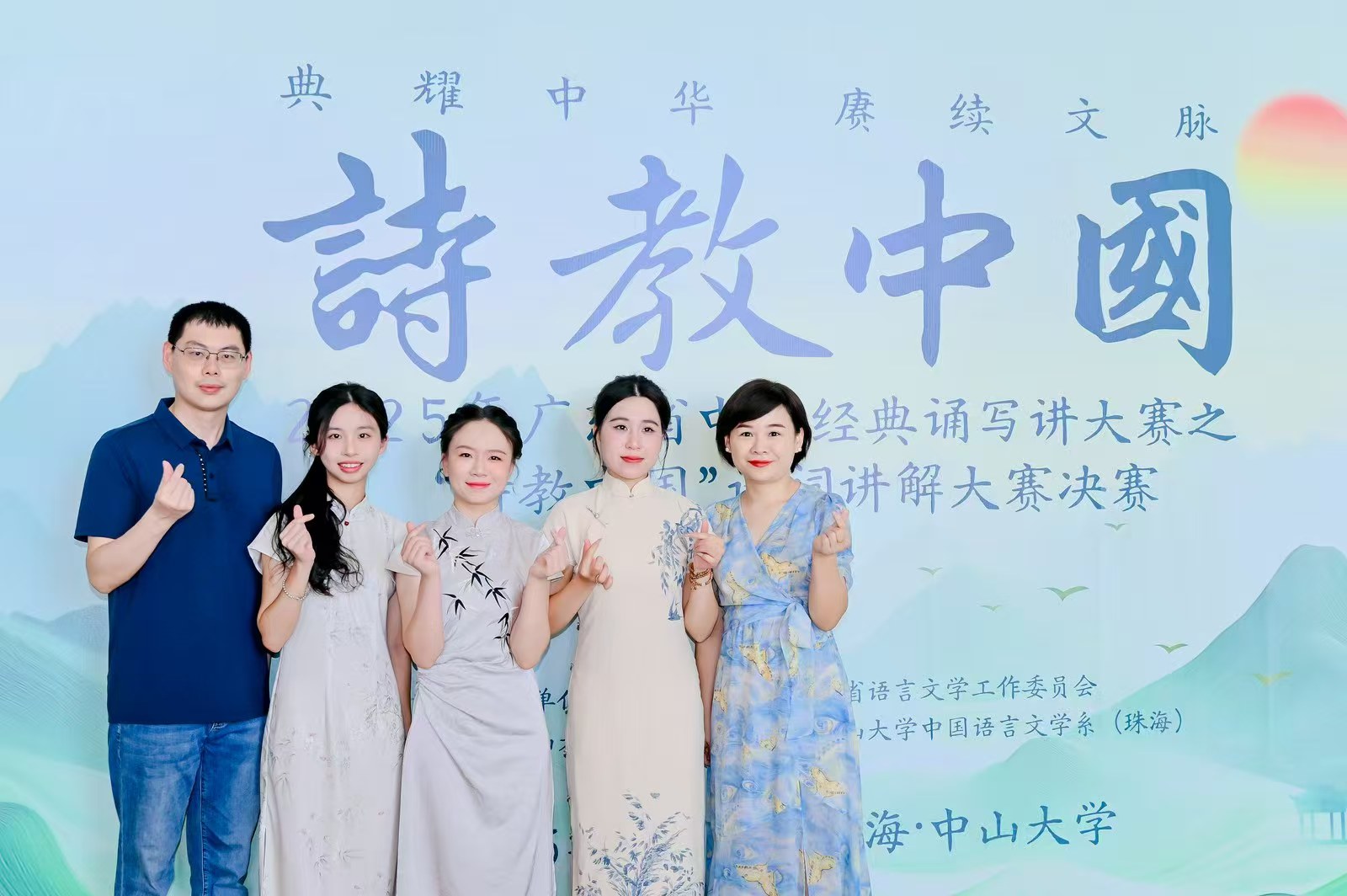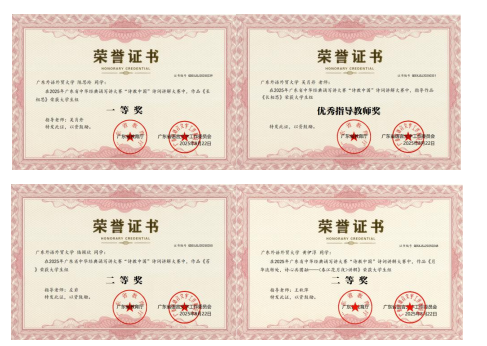 在备赛全程中,taptap点点左岩、吴肖丹、王秋萍三位老师组成专业指导团队,围绕诗词解读、表达技巧与多媒体呈现等方面,为选手提供了系统化、个性化的指导,师生们反复推敲、精益求精。2025年5月,参赛选手赴中山大学(珠海校区)参加广东省中华经典诵写讲大赛“诗教中国”诗词讲解大赛决赛,在现场讲解中沉着自信、表现优异,最终陈思玲同学获得省级一等奖,陆颖欣、黄伊淳同学分获省级二等奖,吴肖丹副教授获评“省级优秀指导教师”。