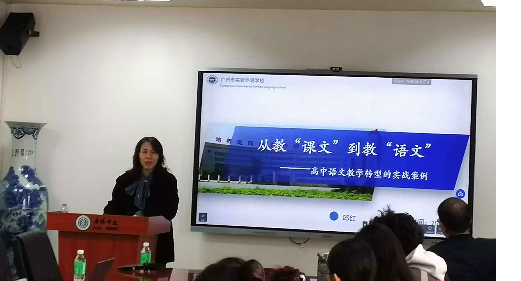 1127日下午,广州市实验外语公司高中语文教研组长邱红老师应邀在白云山校区七教407会议室作题为《从“教课文”到“教语文”——教学实战经验分享》的专题讲座。此次讲座既是中学语文名师系列讲座之一,也是广东外语外贸大学taptap点点20周年院庆系列讲座之一。讲座由贝先明教授主持,学科教学(语文)专业20余名师生参加。